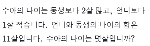 이번 문제는 수아의 나이를 구하는 문제입니다. 수아는 동생보다 2살 많고, 언니보다 1살 적습니다. 언니와 동생의 나이 합이 11살일 때, 수아의 나이를 알아볼까요?