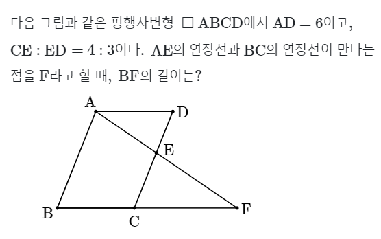 이번 문제는 평행사변형에서 닮음비를 이용하여 선분의 길이를 구하는 문제입니다. 주어진 조건을 바탕으로 선분 BF의 길이를 계산해봅시다.