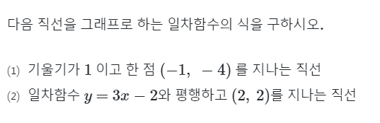 - 문제 2: 일차함수 \(y = 3x - 2\)와 평행하고 \((2, 2)\)을 지나는 직선의 일차함수 식을 구하시오.