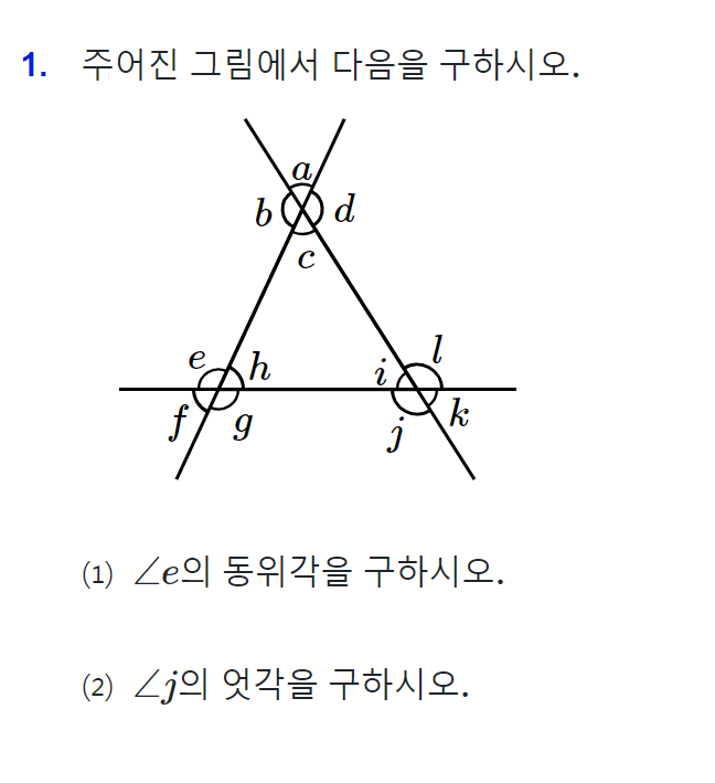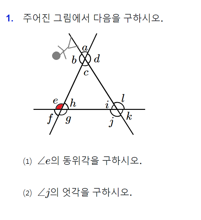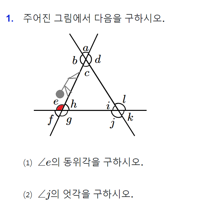 각 e의 동위각을 먼저 찾도록 하겠습니다. 아래 그림을 보시면,