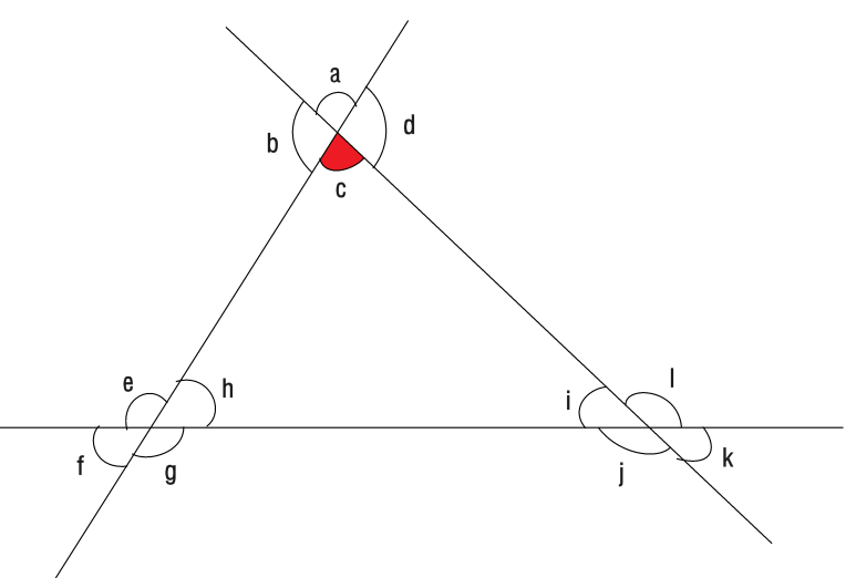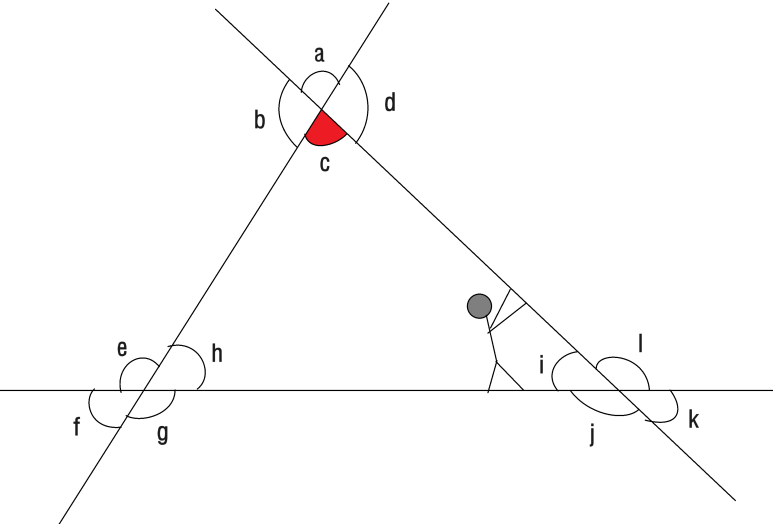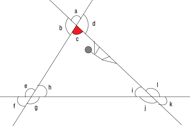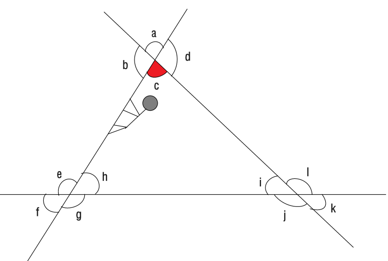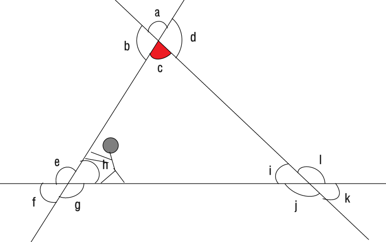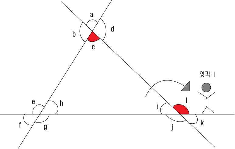 이렇게 하면 각 c의 엇각이 각e, 각 l 이라는 걸 비교적 쉽게 찾을 수 있어요.