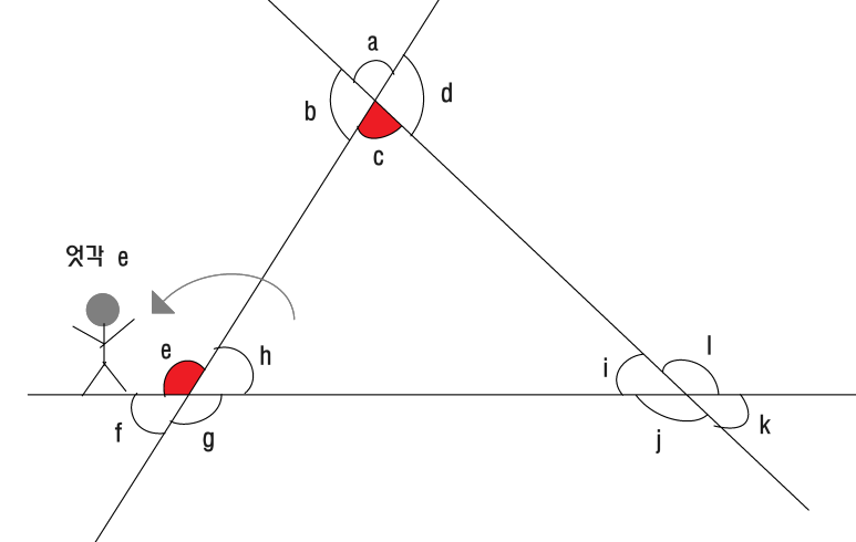 이번에는 엇각을 찾아 볼까요. 각 e 주변에 있는 선을 타고 내려가는 사람을 떠올려볼게요.
