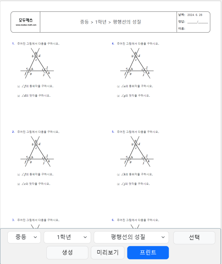 중등 1학년 수학 > 엇각 쉽게 찾는 2가지 방법, 연습문제 프린트 학습지