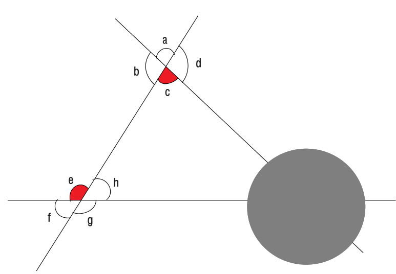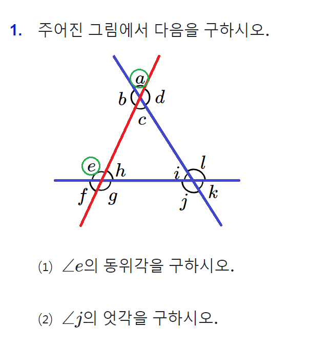 파란 두 직선과 두 직선을 관통하는 빨간 직선이 각 e를 끼고 있는 그림을 만들면, 각 a가 동위각임을 쉽게 찾을 수 있습니다.