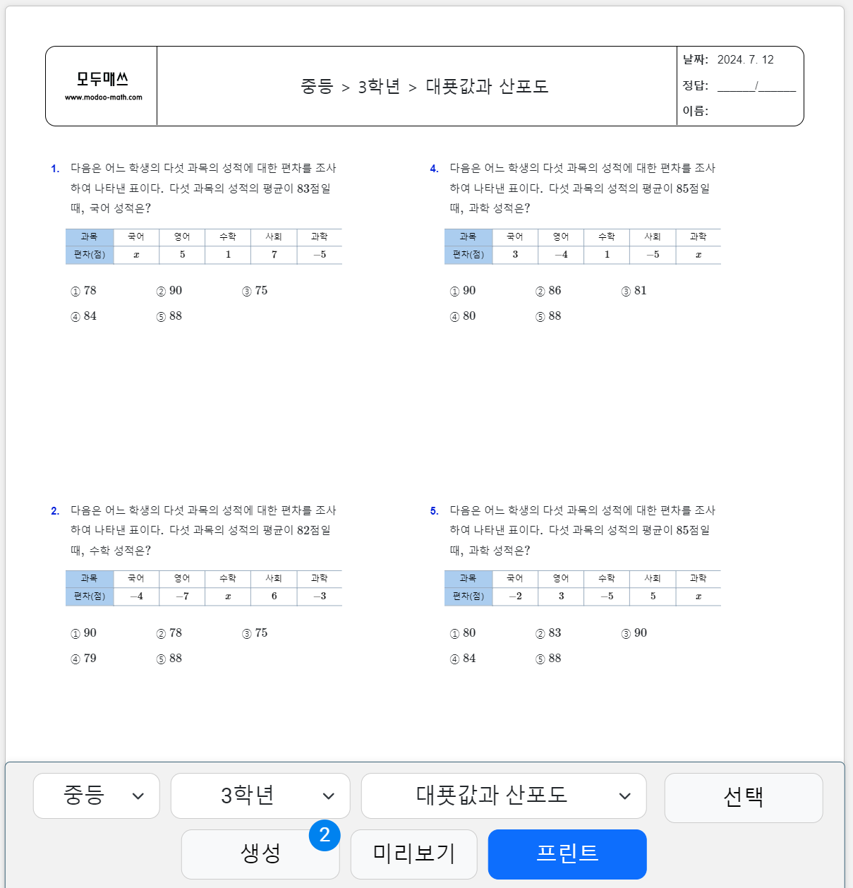 추가로 더 많은 문제를 생성하고 프린트 할 수 있는 '모두매쓰'를 추천합니다.