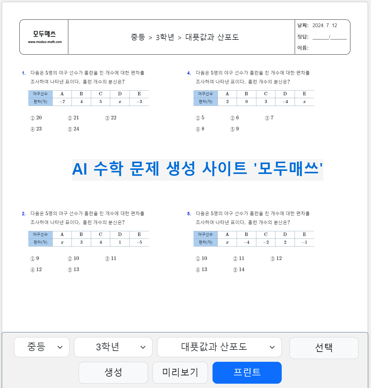 중등 3학년 수학 > 대푯값과 산포도 > 분산 공식, 연습문제 프린트 학습지