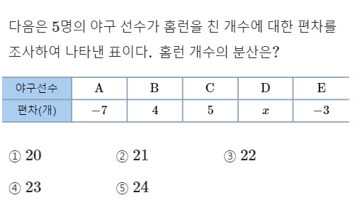 분산을 구하기 직전에 먼저 각각의 변량에 대한 편차값이 있어야 하는데요, 야구선수D의 편차는 $x$로 되어 있습니다. 편차들의 총합은 언제나 $0$이므로