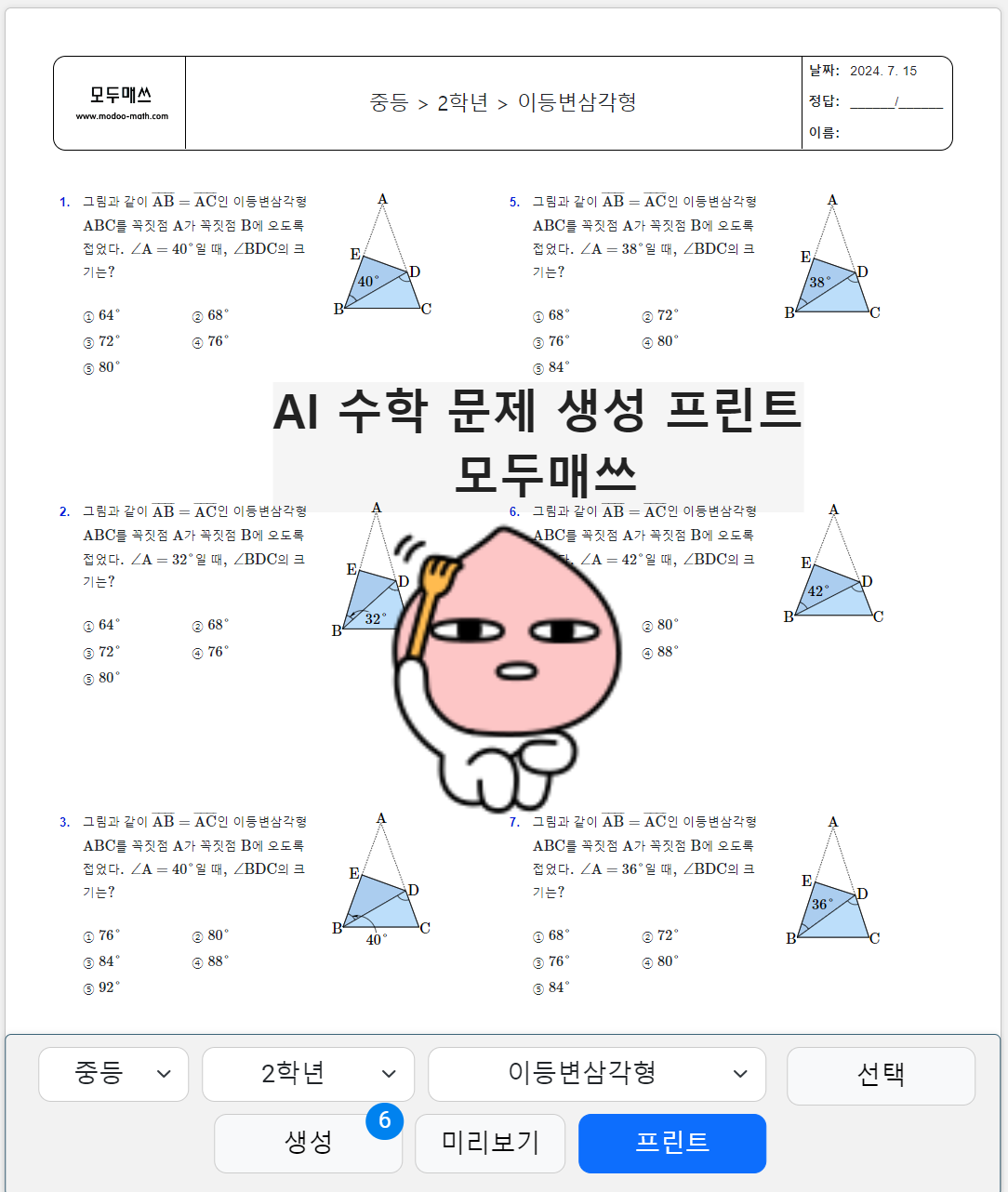 | 중등 2학년 수학 > 이등변삼각형 > 여러 개의 연속하는 이등변삼각형의 각의 크기 구하기 연습문제 프린트 학습지 (0) | 2024.07.15 |