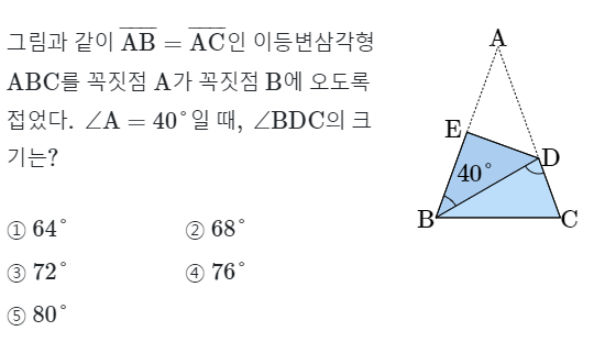 또한 삼각형ABC는 이등변삼각형이므로 $\angle{ACB}=\dfrac{180˚-40˚}{2}=70˚$입니다.