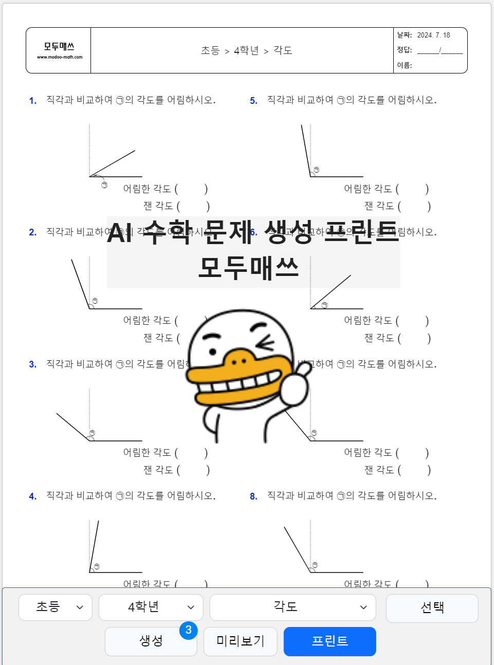 <각의 크기 어림하고 재기 연습문제 프린트>