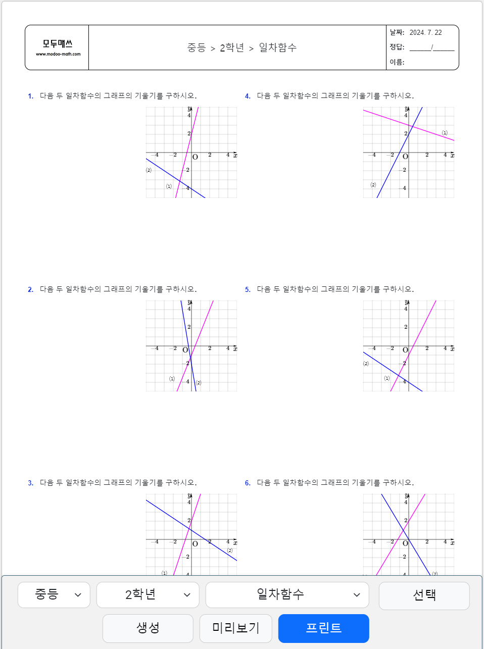 일차함수의 그래프를 보고 기울기를 구하는 연습을 효과적으로 하고 싶다면, 모두매쓰(ModooMath)를 사용해 보세요. 모두매쓰는 다양한 일차함수 문제를 무제한으로 생성할 수 있어, 충분히 연습하고 개념을 확실히 익히는 데 도움이 됩니다.