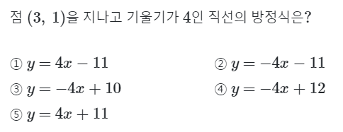 우선 기울기가 $4$이므로 $y=4x+b$라고 식을 세웁니다. 기울기는 $x$의 계수에 곱해진 수이고, $b$는 한 점을 대입하여 구할 수 있습니다.