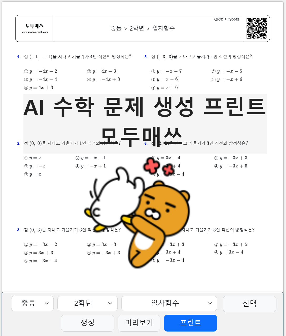 일차함수의 방정식을 구하는 연습을 더욱 효과적으로 하고 싶다면, 모두매쓰(ModooMath)를 사용해 보세요. 모두매쓰는 다양한 일차함수 문제를 무제한으로 생성할 수 있어, 학생들이 충분히 연습하고 개념을 확실히 익히는 데 큰 도움이 됩니다.