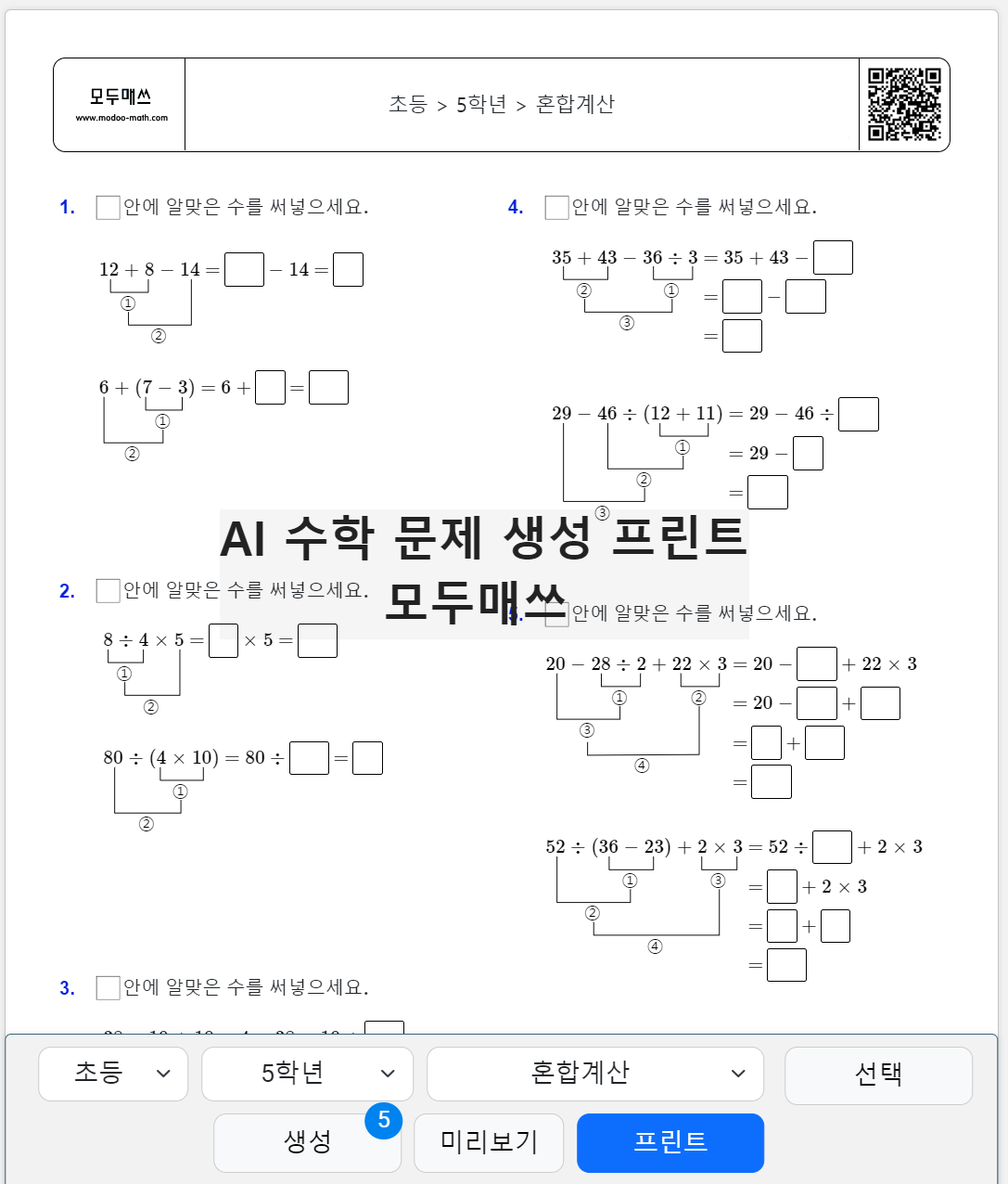 초등 5학년 수학 > 자연수의 혼합계산 순서 정리, 연습문제 프린트 학습지