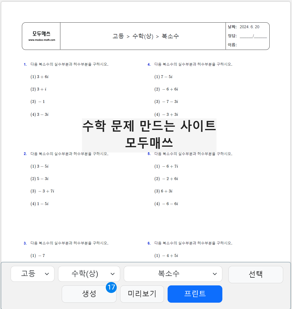 수학 (상) > 복소수 > 복소수의 실수부분, 허수부분 구하기 연습문제 프린트 학습지