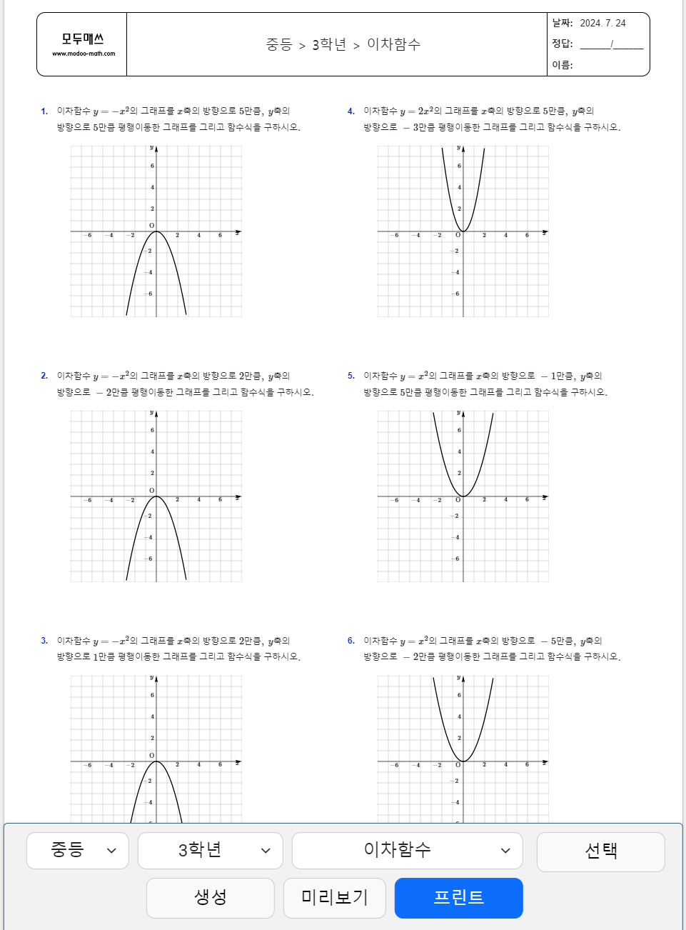 중등 3학년 수학 > 이차함수 > 이차함수의 그래프의 평행이동 연습문제 프린트 학습지