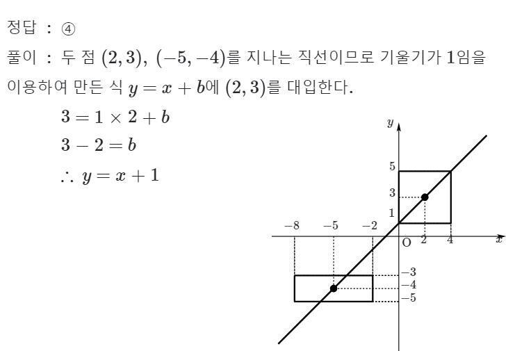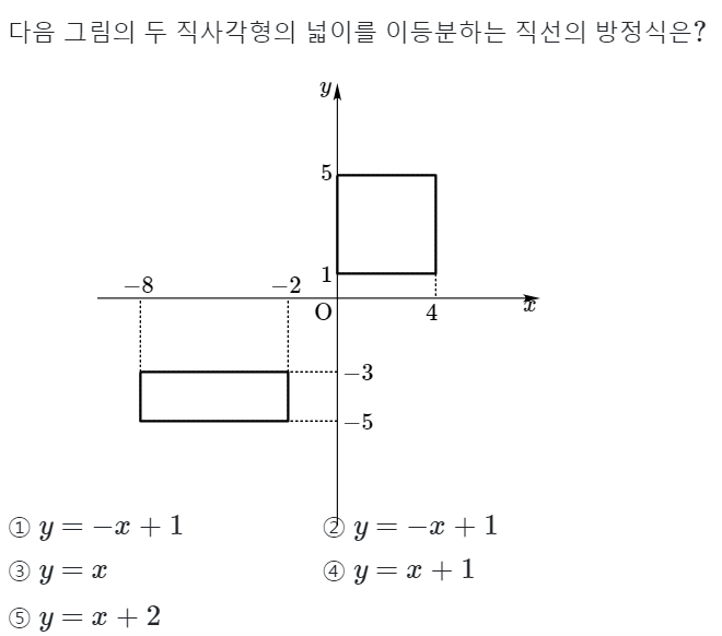 위 그림에서 두 직사각형의 넓이를 각각 이등분하는 직선의 방정식은 각 직사각형의 대각선의 교점을 찾고, 그 두 점을 이용하여 직선의 방정식을 구해야 합니다.
