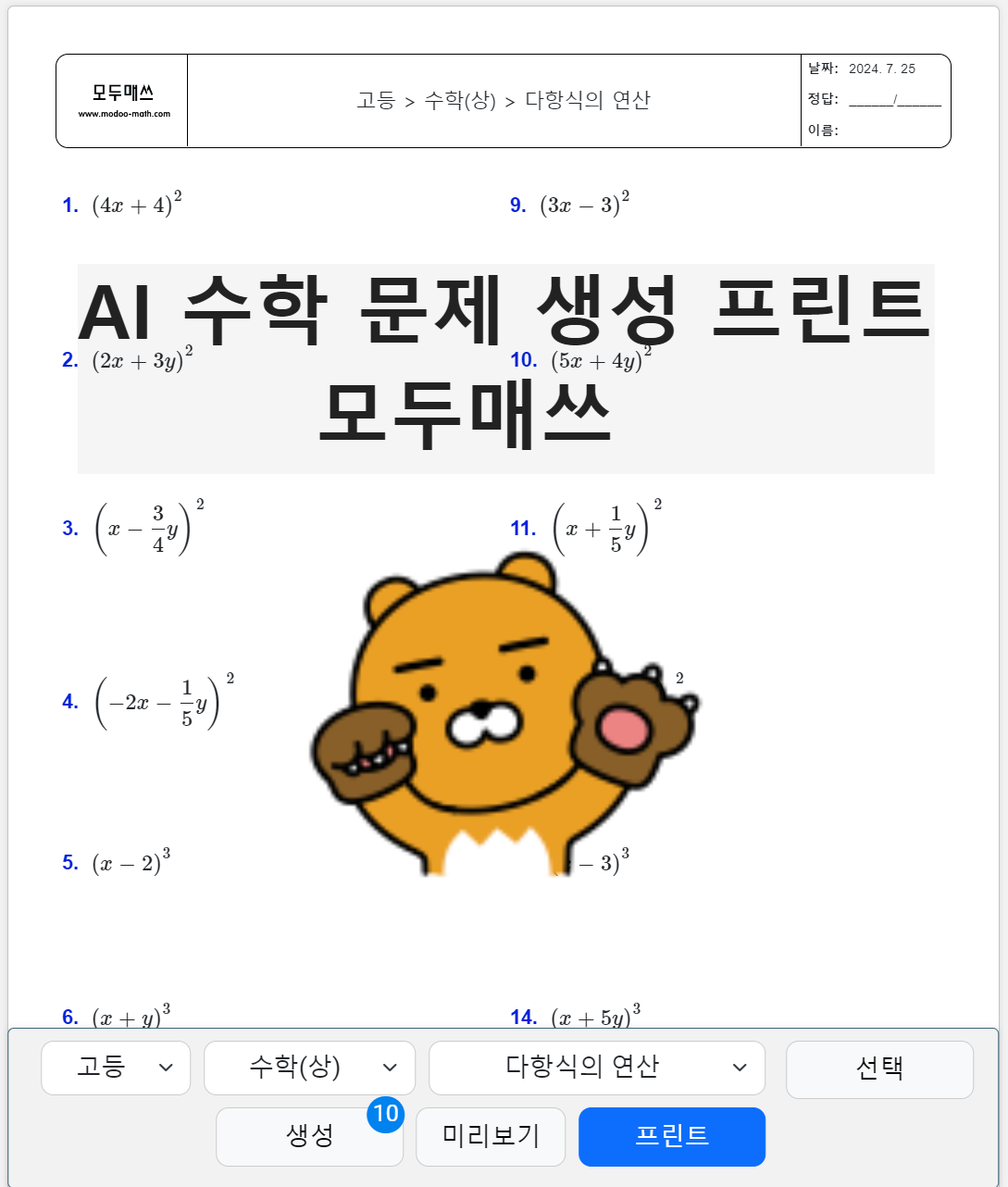 수학 문제를 무제한으로 생성하여 프린트 할 수 있는 '모두매쓰'사이트를 이용해서 만들었습니다.