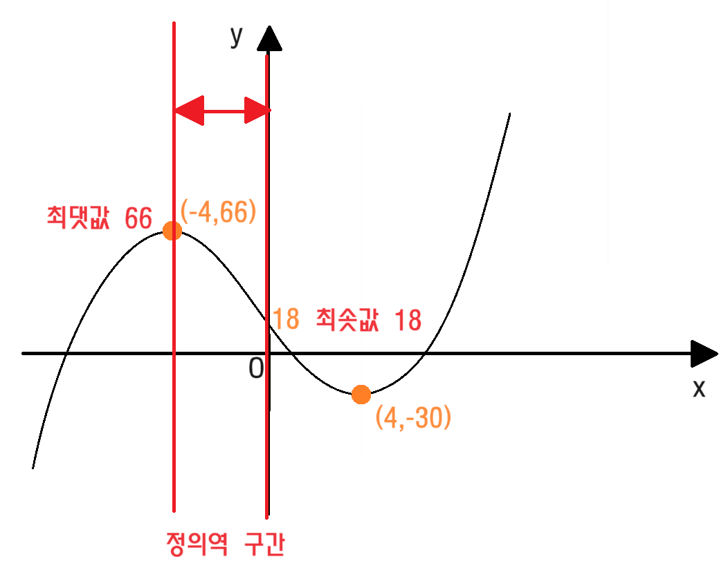 구간안에서 최댓값은 $66$, 최솟값은 $f(0)=18$
