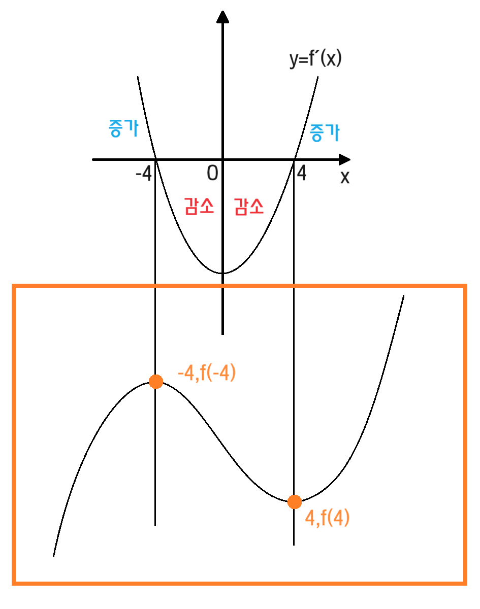 이 그래프에 따르면, 함수 $y=f(x)$ 증가 또는 감소 상태를 알수 있고, 이를 통해 극대값과 극소값을 찾을 수 있습니다.