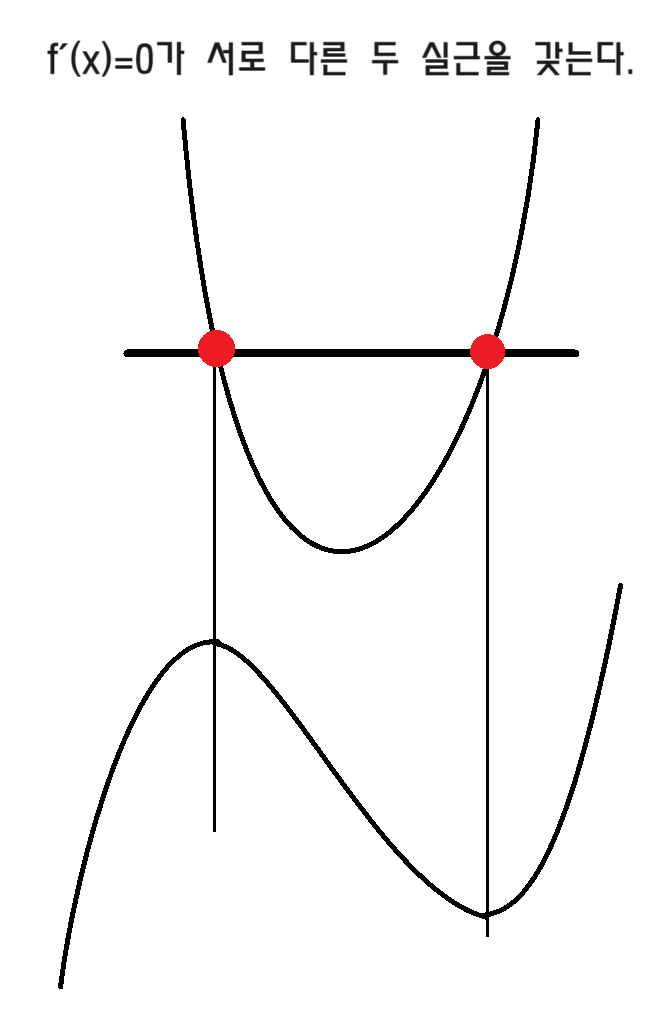 $f'(x)=0$는 이차방정식이며, 이차방정식의 해의 종류가 곧 삼차함수의 그래프 개형을 결정해요.