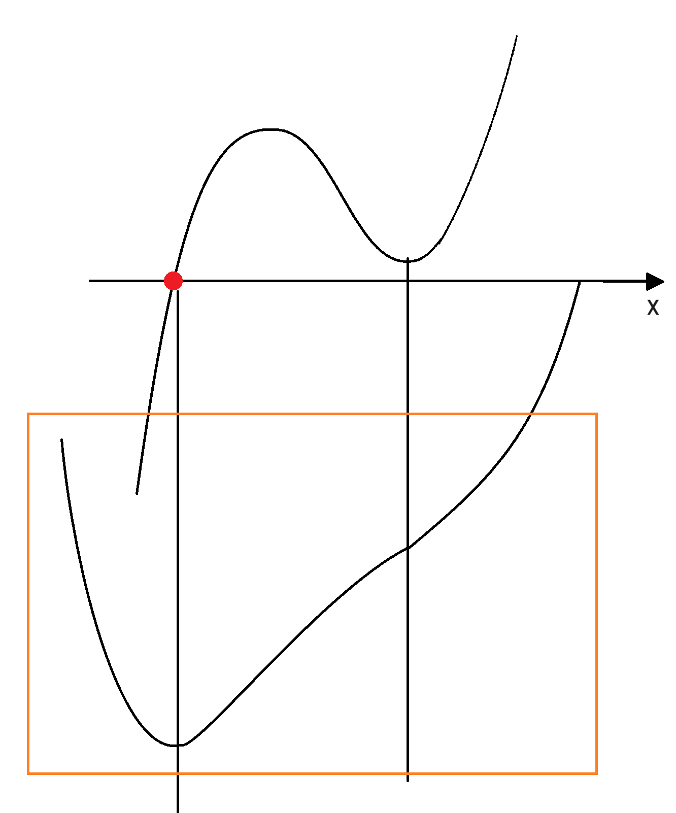 삼차항의 계수가 음수이므로 삼차함수의 모양도 오른쪽 아래롤 향하는 모양입니다.