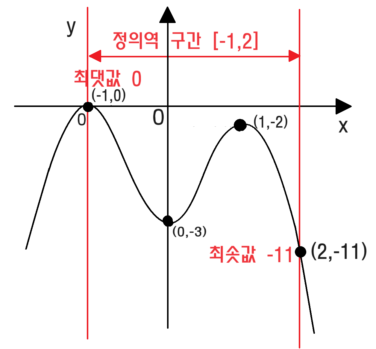 이제 사차함수의 그래프를 좌표평면 위에 적절한 위치에 놓은 후, 정의역 구간에서 최댓값과 최솟값을 구하겠습니다.